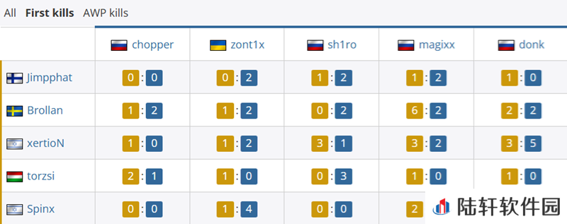 首杀对位上,作为MOUZ指挥的Brollan拿到10个首杀对位胜利,而chopper这一数据为3个。除了Brollan之外,xertioN也为对位贡献了11个首杀对位。Spirit一方donk贡献11个首杀对位,zont1x贡献10个首杀对位。
