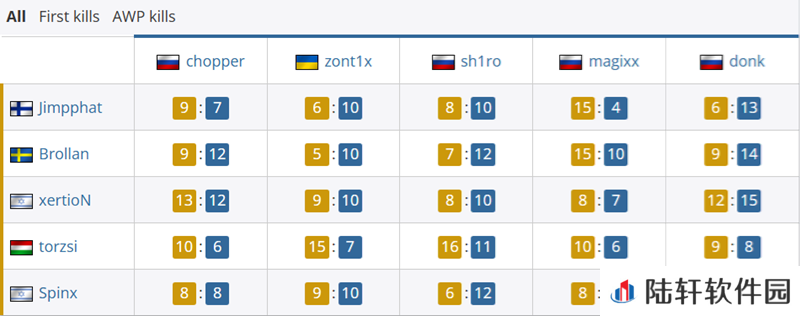 在全部对位数据上,donk除了面对torzsi和Spinx打得有来有回之外,对阵Jimpphat、Brollan都保持着大差值对位优势。而除了他之外,剩下Spirit队员中只有zont1x数据尚可,而magixx面对Jimpphat被打出4-15的对位数据,表现相当惨淡。
