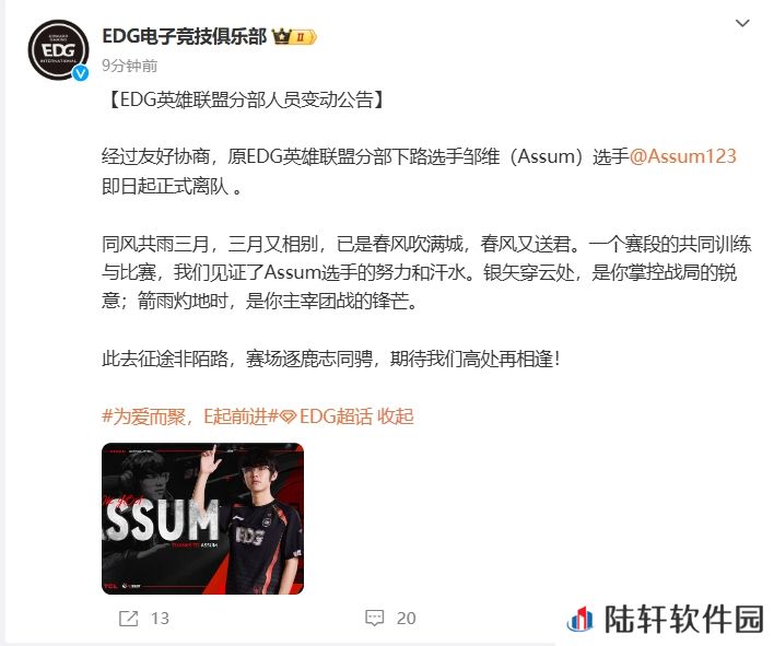 经过友好协商,原EDG英雄联盟分部下路选手邹维(Assum)选手即日起正式离队 。