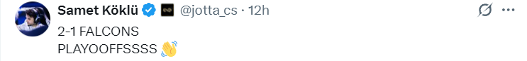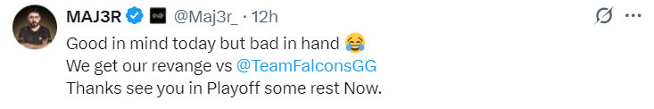 MAJ3R:今天心态不错,但手感不佳。我们成功复仇了Falcons。感谢大家,我们要稍作休息了,期待在淘汰赛再见。