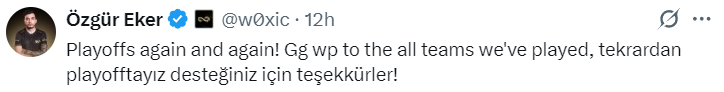 woxic:我们又一次打进了淘汰赛!Gg wp 向所有与我们交手过的队伍致敬,感谢粉丝们一直以来的支持!