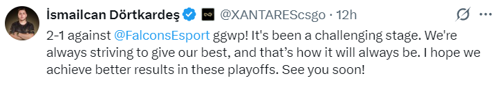 XANTARES:以2-1的比分战胜Falcons,ggwp!这一阶段确实充满挑战。我们始终努力做到最好,这也是我们一直以来的追求。希望在这次的淘汰赛中取得更好的成绩。期待很快再见!