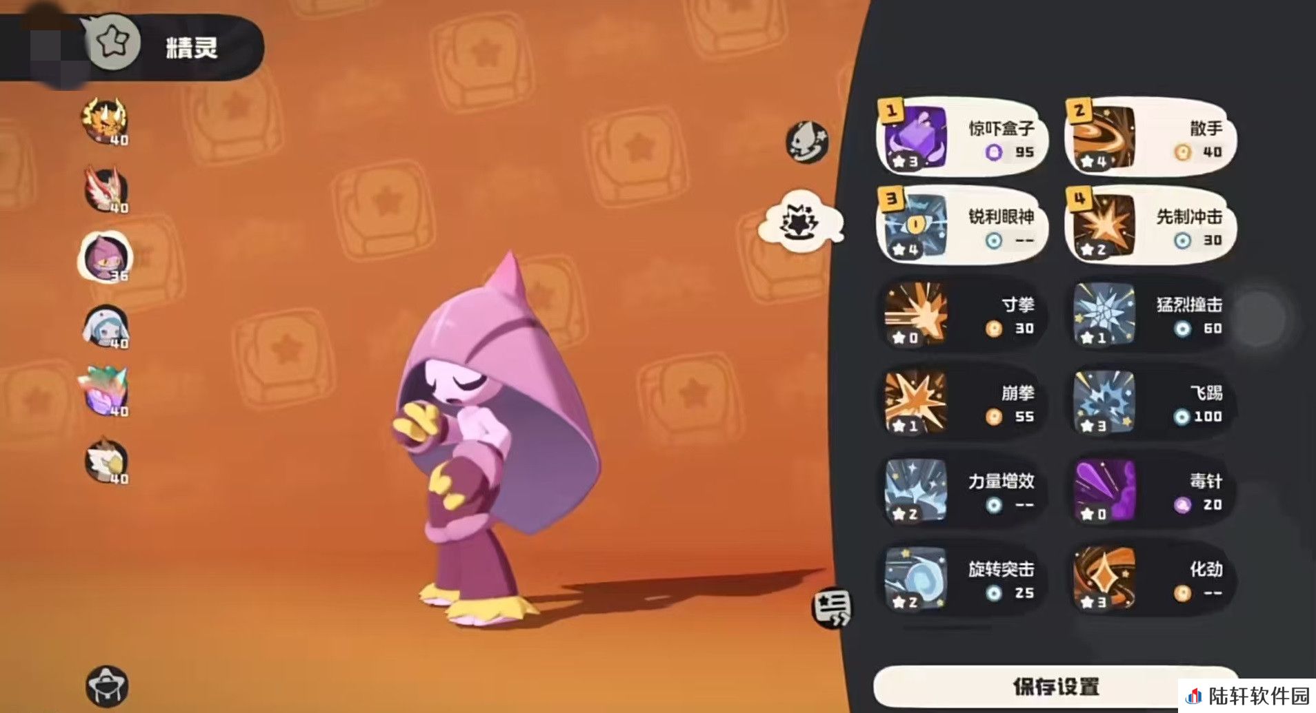 第2个散手,造成物理伤害两连击,应对时进行5连击,应对属于状态技能,耗能4,威力40。寸拳,不消耗能量,使用后获得一点能量,威力30。崩拳耗能1,威力55,造成物理伤害,应对时提升20%物理伤害。惊吓盒子,造成物理伤害,应对时,敌方失去两点能量,耗能3,威力95。锐利眼神,能降低对方90%防御,耗能4。猛烈撞击,对敌方精灵造成物理伤害,耗能1,威力60。